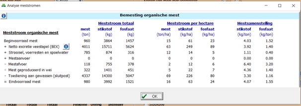 - In de meststromen “Check meststromen” staat een begin- en eindvoorraad van bijvoorbeeld drijfmest. De gehalten van die hoeveelheden zijn door de boer ingevuld.