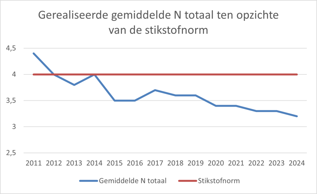 Jarenlang worden er door onze leden mestmonsters genomen, waarin de ontwikkeling van deze gedachtegang te zien is. Uit onderzoek naar onze mestmonsters (meer dan 1000 monsters)kunnen wij statistisch aantonen dat sinds de invoering van vrijstelling de totale hoeveelheid stikstof onder de forfaitaire waarden liggen (zie figuur 1.)